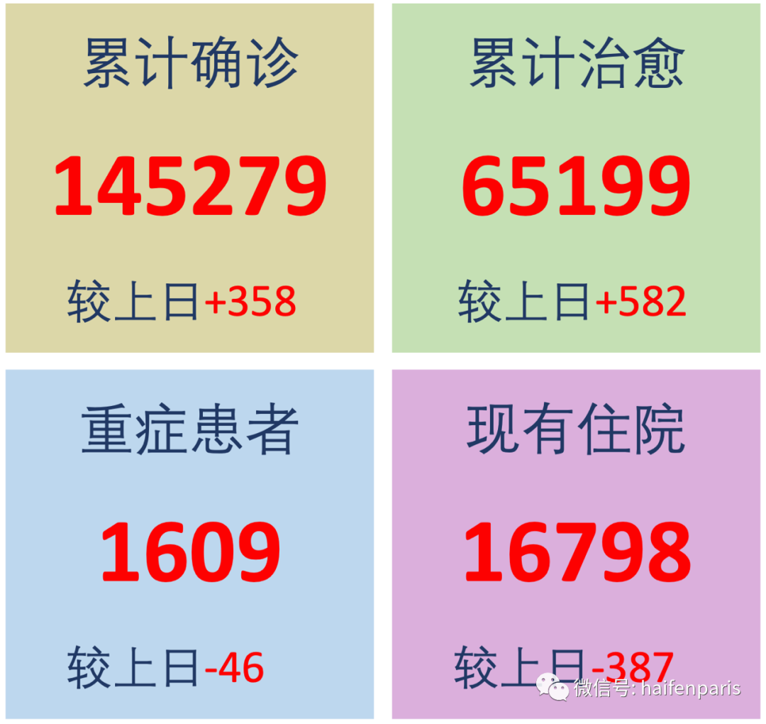 法国今天疫情: 今天法国新冠肺炎确诊患者达145279例; 住院人数16798例(24小时内新增了342个住院病人); 重症患者1609例; 出院总数65199例。 第一:Beauval博瓦尔动物园于6月2日重新开放 在法媒5月25日星期一发布的新闻稿中,博瓦尔动物园宣布计划于2020年6月2日重新开放大门!如何组织才能安全地重新开放?切待细则出来…… 第二:巴黎地下墓穴将于6月中旬重新开放 巴黎地下墓穴是在巴黎的地下地下采石场。据介绍此墓穴将会在2020年6月16日之前对公众开放,但是会建议采取适合健康的安全措施。 第三:法国生态转型部长伊丽莎白·伯恩(Elisabeth Borne)宣布:政府将在本周晚些时候专门解释有关暑假的新规定。我们何时都能超越100公里?露台和餐厅等是否开放? 也有媒体说:6月2日应该可以知道何时可以重新开放法国人所缺少的餐馆、酒吧、咖啡馆、电影院、博物馆、和其他生活场所的日期。 第四:法国人应避免在国外度假 尽管有冠状病毒,法国人今年夏天还能去国外度假吗? 法国生态部长伊丽莎白说:最好留在法国。但是目前建议“开始预订7月和8月的车票等”。 第五:市政府学音乐班今年9月之前不会重新开放;明年的报名将于6月2日开始。 第六:今天,法国行动和公共财政大臣盖拉德·达曼宁(GéraldDarmanin)承诺:免除餐饮、旅游、文化体育等受到新冠病毒重创的50万家公司共30亿欧元的费用。 第七:巴黎证券交易所对解禁持乐观态度(+ 2.15%)。 今天,巴黎交易所(B巴黎证券交易所)对解禁持乐观态度。该报告的分析师丹尼尔·拉鲁图鲁(Daniel Larrouturou)强调说,这“证明了投资者对经济体持乐观态度,并相信将不会再出现第二波冠状病毒”。 第八:为安全起见,世卫组织暂时暂停使用羟氯喹的临床试验。 第九:法国的StopCovid应用程序已根据负责该项目的团队的要求,对士兵进行了测试。目的是“验证StopCovid应用程序的运行,并在实际条件下测量不同情况下的检测结果”。据悉该应用程序将在于6月2日投入使用,目的是允许每个了解其可能病毒的用户发出警告,以便大家可以采取预防措施。 第十:法国总理菲利普在“Ségurde lasanté”发布会上说:我们将启动一项庞大的投资、援助医院计划。目前投资多少?还没有具体数字。总理宣布:“我们必须致力于医院的投资,加快城市医院及公共与私营部门之间的合作。” 第十一:法国前总统弗朗索瓦·奥朗德(FrançoisHollande)首次接受媒体采访承认:“在医院方面,我也应承担责任”。他承认自己对此次健康危机的过失,并提出了类似计划的刺激方案。 奥朗德对卫生系统中的缺陷以及维护公共服务的必要性作了详尽的评论。 然后,他回忆说,在他任职期间,他创造了3万个医院工作岗位,并把医院工作人员的工资帐单提高了7%,但他承认这还不够。 他提到,自己就任的时候法国有10亿口罩的库存,在离任的时候有7.4亿口罩的库存,但是在疫情开始的时候法国只有1.4亿口罩。他呼吁建立一个调查委员会对此进行专门调查。 第十二:法国相关部门呼吁必须继续动员起来,防止新冠病毒的蔓延。 具体是:尽可能保持远程办公;尽可能避免在高峰时段旅行;为了大家的安全,出行请戴上口罩;多洗手;尽量用非接触式的付款方式;可能的话,考虑自行车、Véligo电动助力自行车等其他出行方式。 第十三:法国政府宣布:自6月1日起,公司将承担工作成本的15%,其余85%仍将由国家和Unédic承担。 推广 |
