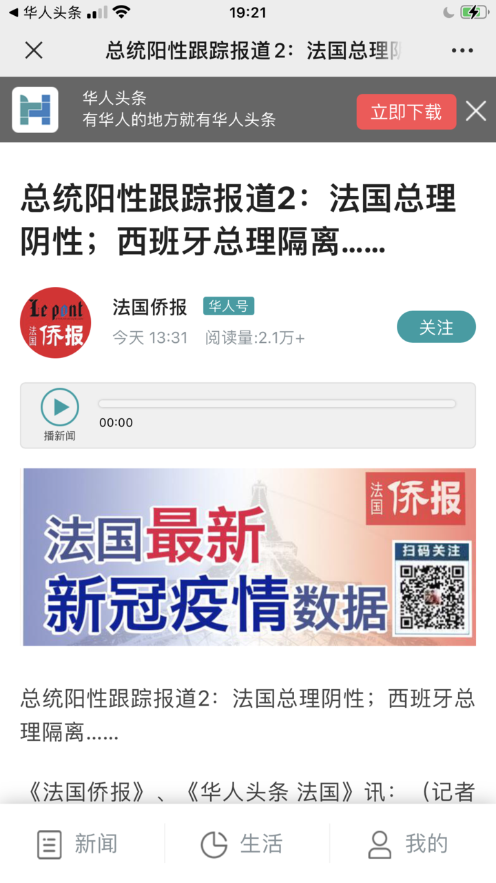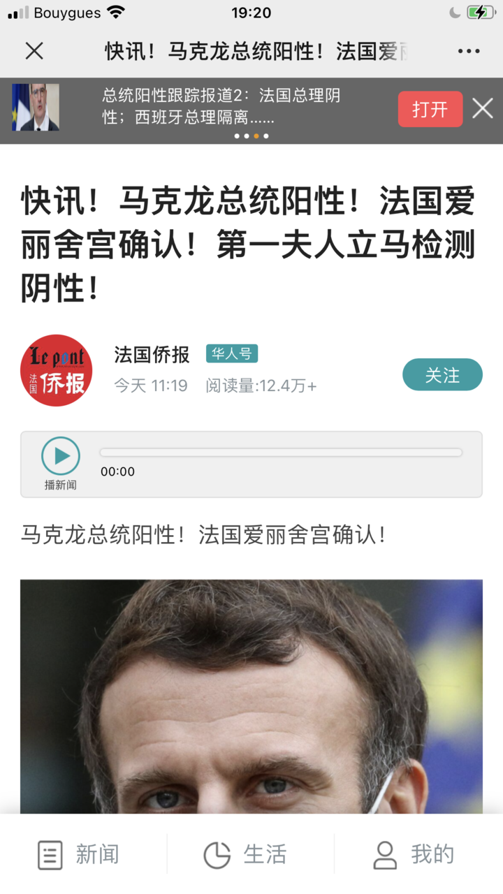 2020年12月17日星期四 巴黎晴朗 今天不寻常:马克龙总统阳性! 晴天霹雳! 今天早上9:20分,小编接到热心的巴黎L朋友每天一如既往的新闻法语推送,没想到今天竟然是马克龙总统中标! 手忙脚乱地查资料、翻译…… 《巴黎人报》接着说:比利时首相、葡萄牙总理、西班牙总理和卢森堡政府首脑以及欧洲理事会主席查尔斯·米歇尔被隔离…… 接着看法媒,电视台已经铺天盖地挖出总统这几天所有的活动行程,密切接触的人: 12月10日至11日,马克龙曾在比利时布鲁塞尔参加欧洲理事会。 据法新社报道,周三(16日)晚,马克龙组织工作晚餐会,约有12人参加,包括总理卡斯泰、国会议长费朗、执政党“共和国前进党”负责人卡斯塔内,民主运动党(MoDem)弗朗索瓦·白鲁,总统府秘书长科莱(Alexis Kohler)等人。 12月16日周三会见葡萄牙总理科斯塔(Antonio Costa)…… 认真、敬业的法媒记者们对比法国对新冠疫情隔离期间的要求一天天盘算: 马总统请客没有开窗通风; 马哥请客超过6人了; 中文媒体也以龙仔中招、马仔中标、马哥等爱称纷纷报道…… 《法国侨报》、《华人头条 法国》以“快讯!马克龙总统阳性!法国爱丽舍宫确认!第一夫人立马检测阴性!”为标题,在今天上午11:19分发出独家新闻后,点击率已经达到12.4万人次;