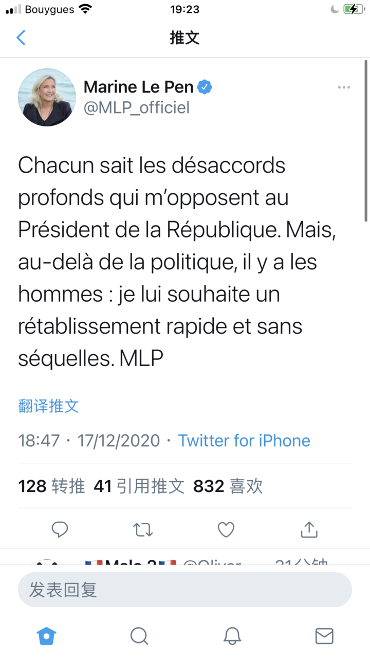 总统阳性消息传出后,社交网络媒体上闹翻天了: 不仅各国政要如英国首相鲍里斯约翰逊、德国政府发言人德法双语转达总理默克尔的祝福等大家纷纷送上祝福,就连法国的勒庞也在推特上发表了她的祝福: