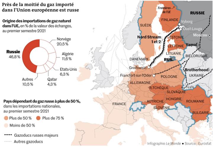 法国和乌克兰之间没有国防方面的协议,所以不会向乌克兰派士兵。 不过马克龙周五在布鲁塞尔宣布法国会向(北约成员国)罗马尼亚部署兵力。并且,“我们准备好派送物资,和向民众提供支援性质的物资。” 欧盟成员国40%的天然气来自俄罗斯。 下图上,颜色越深的地区对此的依赖就越强。 法国有差不多20%是来自俄罗斯的,德国则是56%。 目前来说,欧洲对俄的制裁有限,造成的经济影响也有限。 所以在当下应该并不会导致价格上涨。 推广