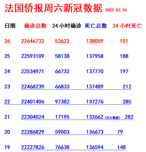 《法国侨报》讯:(记者 玉英)法国卫生部网站最新数据:24小时内法国新增阳性53623人!阳性总数为22600000+46732人。24小时内有101人死亡,死亡总数有138059人!