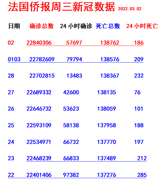 《法国侨报》讯:(记者 玉英)法国卫生部网站最新数据:24小时内57697人新增阳性!阳性总数为22840306人。 24小时内有186人死亡,法国共有138762人死亡。