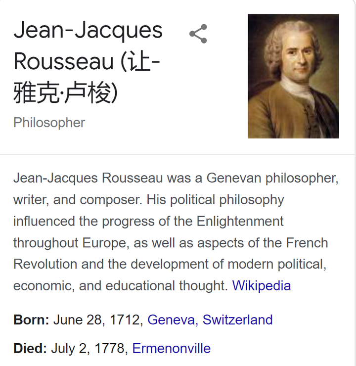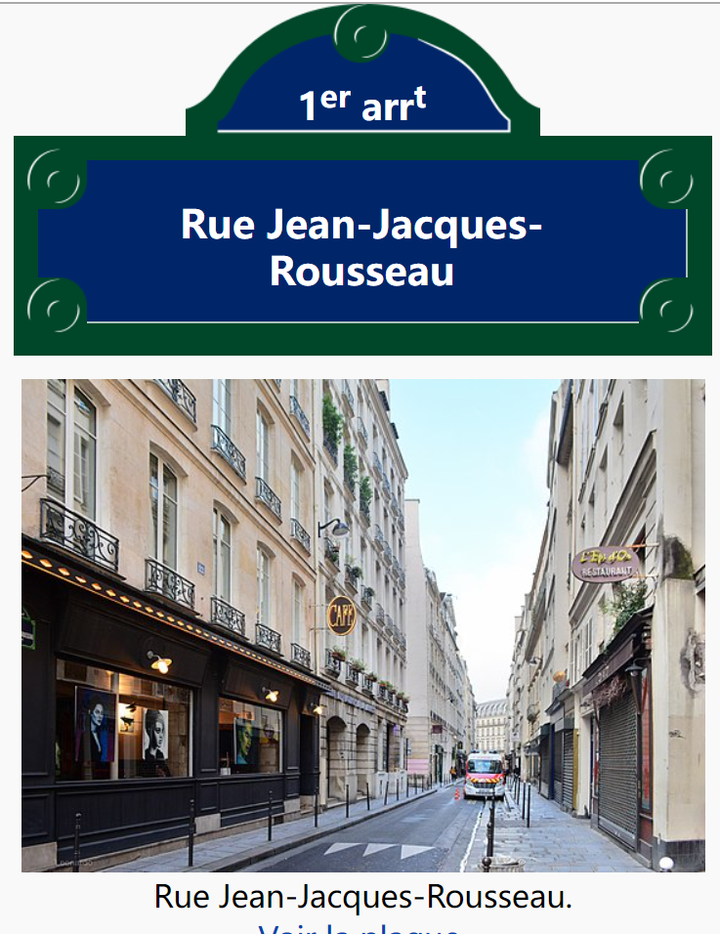 我开始从网络百科查找…… 果然!Rue Jean-Jacques-Rousseau=让-雅克-卢梭! 资料里说:早在1791年,这条街在法国宪法会议同意下,改名为 "RueJean-Jacques-Rousseau"的!目的就是为了纪念1770至1778年居住在那里的著名作家和哲学家卢梭等文人墨客……