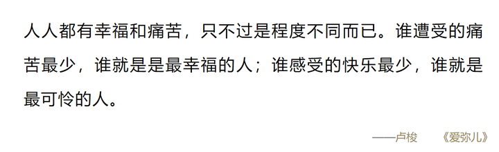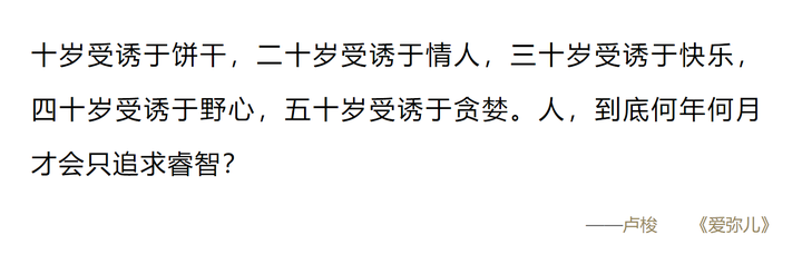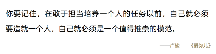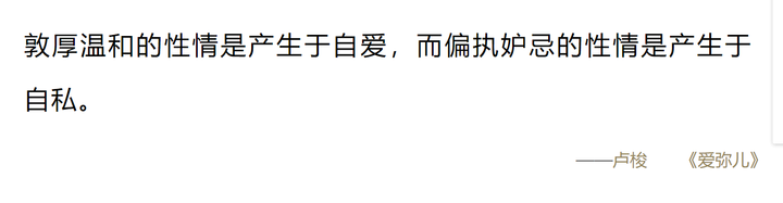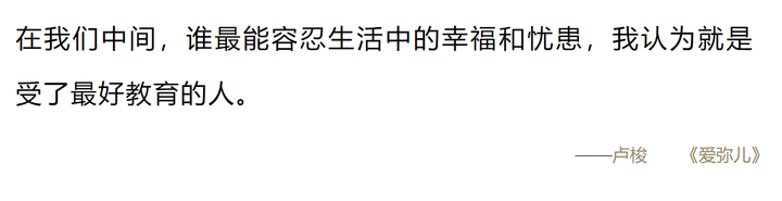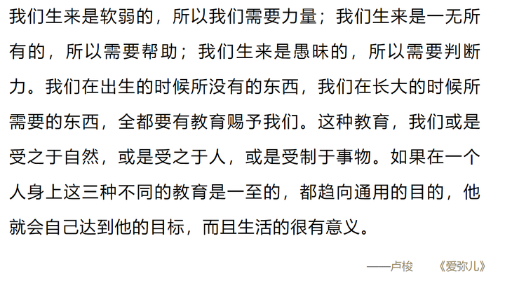 论孩子 1,童年是理智的睡眠期。 2,在儿童时期没有养成思想的习惯。将使他从此以后一生都没有思想的能力。 3,我们总是在孩子身上找大人,却从不想想他在变成大人之前只是个孩子。 论生活、自律、教育等: 1,“由自爱而产生的对他人的爱,是人类正义的本源。” 3,“在我们中间,谁最能容忍生活中的幸福和忧患,我认为就是受了最好教育的人。” 3,“为了保持我们的生存,我们必须要爱自己,我们爱自己要胜过爱其他一切的东西。” 4,“我们的一切痛苦都是源于欲望与能力的不符。” 5,“人的一切不幸都是源于过多的欲望。一个幸福的人是能控制自己欲望的人。” 6,“温和的性情是产生于自爱,而偏执妒忌的性情是产生于自私。” 7,一个人如果想有所作为,想做自己,想总是能与自己和谐相处,就必须言行一致,就必须果断决定自己走什么路,并热情满怀地坚持沿着这条路走下去。 人类幸福起源于愿望与能力的平衡。 8,你要记住,在敢于担当培养一个人的任务以前,自己就必须要造就一个人,自己就必须是一个值得推崇的模范。 9,没有信念,就没有真正的美德。 10,人人都有幸福和痛苦,只不过是程度不同而已。谁遭受的痛苦最少,谁就是是最幸福的人;谁感受的快乐最少,谁就是最可怜的人。 11,我们生来是软弱的,所以我们需要力量;我们生来是一无所有的,所以需要帮助;我们生来是愚昧的,所以需要判断力。我们在出生的时候所没有的东西,我们在长大的时候所需要的东西,全都要有教育赐予我们。这种教育,我们或是受之于自然,或是受之于人,或是受制于事物。如果在一个人身上这三种不同的教育是一至的,都趋向通用的目的,他就会自己达到他的目标,而且生活的很有意义。 12,十岁受诱于饼干,二十岁受诱于情人,三十岁受诱于快乐,四十岁受诱于野心,五十岁受诱于贪婪。人,到底何年何月才会只追求睿智?——卢梭《爱弥儿》 13,生活得最有意义的人,并不就是年岁活得最长的人,而是对生活最有感受的人。 14,因为做有意义的事情,其本身就是对生活的享受。 15,如果你的目的只是想到某一个地方去,你当然可以坐驿车,但是,如果是为了游历,那就要步行了。 16,人类似乎有这样的倾向,建立一项规则叫别人遵守,同时又极力使自己成为例外,不受它的约束。 17,卢梭崇尚情感,认为情感高于理性,他认为理性会败坏人类道德,使人变得冷漠。 18,如果流动,就流走;如果静止,就干涸;如果生长,就慢慢凋零,这个世界没有永恒。 19,我反复说过,真正的幸福是不能用语言描绘的,它只能用心体会,感受越深就越无法描述,因为真正的幸福不是一系列事实的积累,而是一种状态的持续。 住房真的和幸福、赚钱有关系吗? 当然!环境最能影响人了! 古时孟母三迁为了啥? 环境对人的影响最大! 能够住进这样屋顶有棕色房梁,有5个朝南落地窗,穿过塞纳河的阳光,每天笑眯眯地透过落地窗,温柔地照射到房子的各个地方……