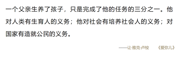 卢梭论男人和女人: 1,“一个女人可以用化妆品来出一出风头,但要获得别人的喜爱,还要依赖他的人品。” 2,一个父亲生养了孩子,只是完成了他的任务的三分之一。他对人类有生育人的义务;他对社会有培养社会人的义务;对国家有造就公民的义务。
