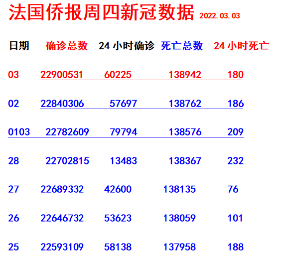 《法国侨报》讯:(记者 玉英)法国卫生部网站最新数据:24小时内法国新增阳性60225人!总人数达到22900531人。 24小时内有180人死亡,死亡总数有138942人!
