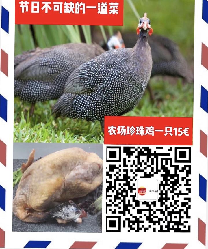 蔡先生这里团购才15欧!还杀好,送货上门!太划算啦! 愿意和我们团购珍珠鸡的朋友,请微信扫码……