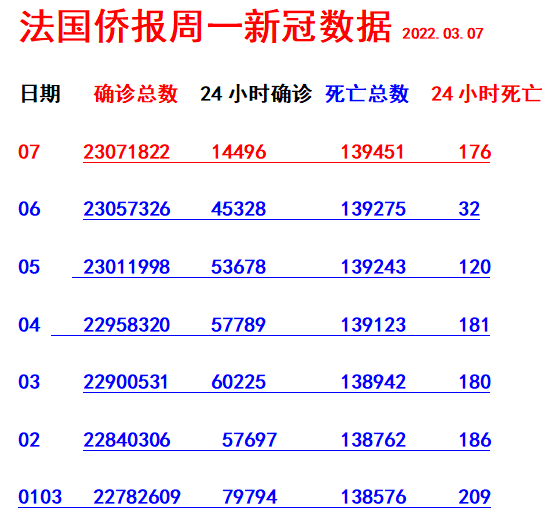 《法国侨报》讯:(记者 小玉)法国卫生部网站最新数据说:24小时内法国新增阳性14496人,阳性总数达到 人; 24小时内有176人死亡,死亡总数达到139451人。