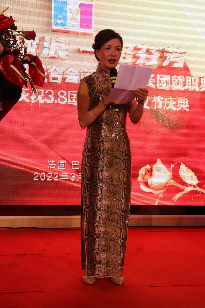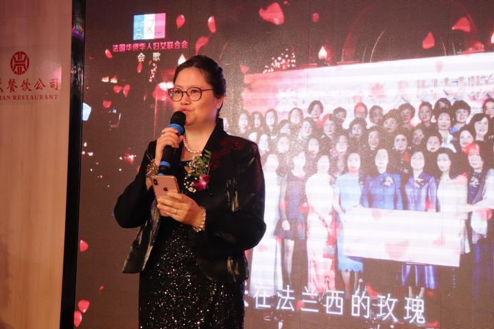能承接这样一个有传统,有抱负的团队,我感到很幸运,也很有压力,作为经过两年多新冠特殊的洗礼,承上启下的新一届会长团会长,我首先要感谢前几任会长打下的坚实基础;同时我也想向信任我的会员姐妹们保证,在我的任内,将责无旁贷,全力以赴,和会长团姐妹们一起,继续保持协会的公益慈善,关心弱势群体的优良传统,继续与中国妇联、法国妇女组织等加强联系,展示旅法女性的形象和力量,继续团结旅法各界妇女同胞,鼓励她们扮演家庭和事业等多重角色,发展年轻新会员,吸收知识精英女性,提升凝聚力和代表性,在驻法使馆和旅法兄弟侨团的帮助下,延续协会的辉煌,走出一片新的天地! 法国华侨华人会妇女主任、法国亚洲餐饮同业联合会会长黄美娜代表旅法侨界妇女代表致辞,希望法国的妇女姐妹们携手共进,再创辉煌!