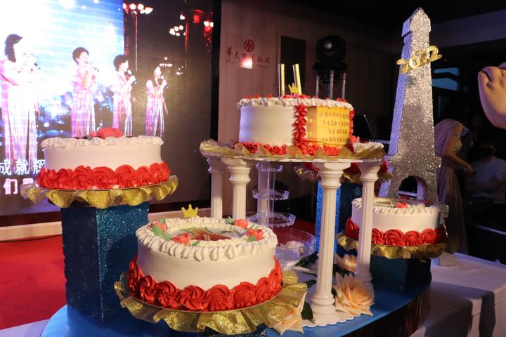妇女会核心部长团胡丽蓉、翁献勤、杨玉英宣读了部分贺电后,第七届会长团全体起立,一起唱起了妇女会会歌,切下了喜庆生日蛋糕……