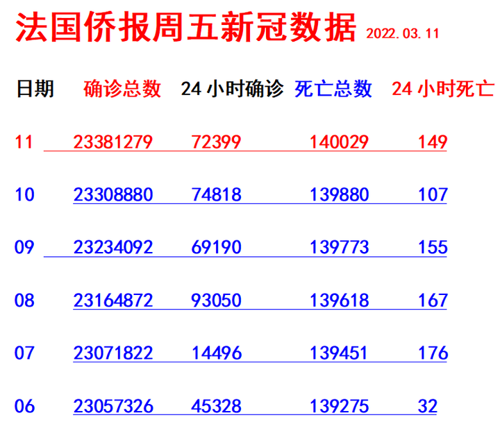 《法国侨报》讯:(记者 小玉)法国卫生部网站最新信息:24小时内法国72399人新增阳性,阳性总数达到23381279 人。 24小时内有149人死亡,死亡总数为140029人。