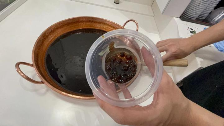 心里数了一下正在忙着工作的员工:一律穿着黑色,写有黑珍珠的体恤,总共有7个年轻人,3女4男,男女搭配,干活不累…… 给我做珍珠奶茶的男孩首先从金色的黑珍珠锅里,熟练地挖起一勺黑珍珠,熟练地便转动被子,边倒进去…… 很好,很专业,挂壁很到位……这样的奶茶,四周都会沾有金色黑色混合的颜色,再和后面的奶茶融合,上面的焦糖再经过小火轻烤,就会有一杯超级入味、色泽诱人的奶茶出来了……