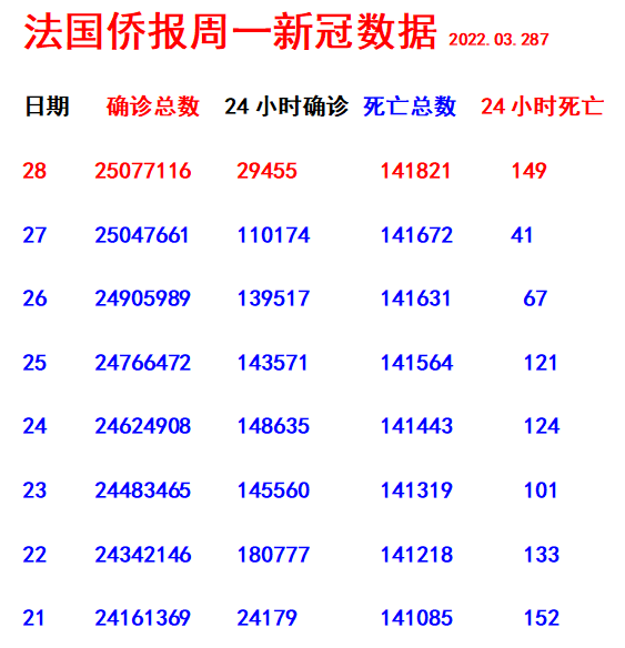 (来源: https://www.sortiraparis.com/actualites/coronavirus/articles/216011-coronavirus-en-france-ce-lundi-28-mars-2022-149-morts-du-covid-et-29-455-nouveaux-cas https://www.leparisien.fr/societe/sante/covid-19-en-direct-le-passe-vaccinal-entre-en-vigueur-en-martinique-28-03-2022-ZUDVQNFUZNCHPNCWNQ7SKATJD4.php)