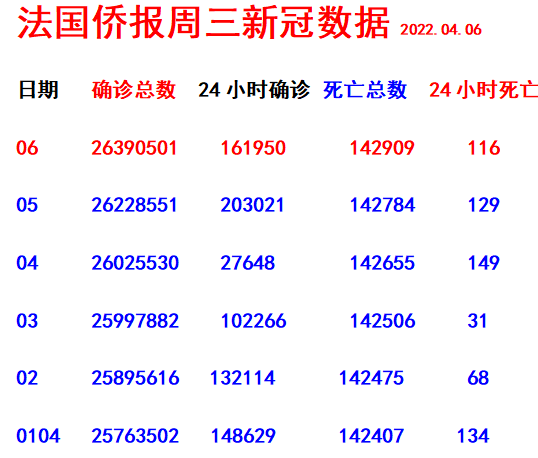 《法国侨报》讯:(记者 玉英)来自法媒数据:24小时内法国新增阳性161950人,阳性总数达到26390501人; 24小时内死亡116人,累计死亡人数达到142909人。