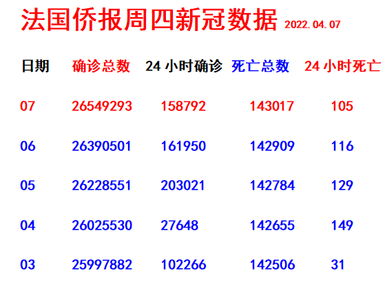 《法国侨报》讯:(记者 玉英)法国卫生部网站消息说:24小时内有158792人新增阳性,法国阳性总数达到26549293人; 24小时内死亡105人,死亡总数达到143017人。