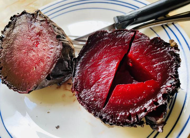 我迫不及待地切开红甜菜头,吃一口,哇,香,微甜,软绵绵,好好吃……我马上剥掉红甜菜头外面的皮(居然和烤地瓜皮差不多的样子!一撕,皮就自动掉了!)一口气就吃了半个红甜菜头……幸福感涌满了我的全身……