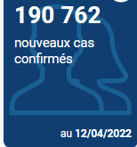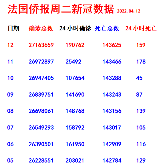《法国侨报》讯:(记者 玉英)法国卫生部网站信息:24小时内法国190762人新增阳性! 24小时内有159人死亡,死亡总人数为143625人。