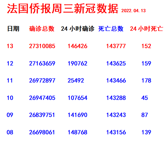 《法国侨报》讯:(记者 玉英)法国卫生部网站信息说:24小时内法国新增14.6万人,阳性总数达到 27310085 人; 24小时内法国有152人死亡,死亡总数为143777人。
