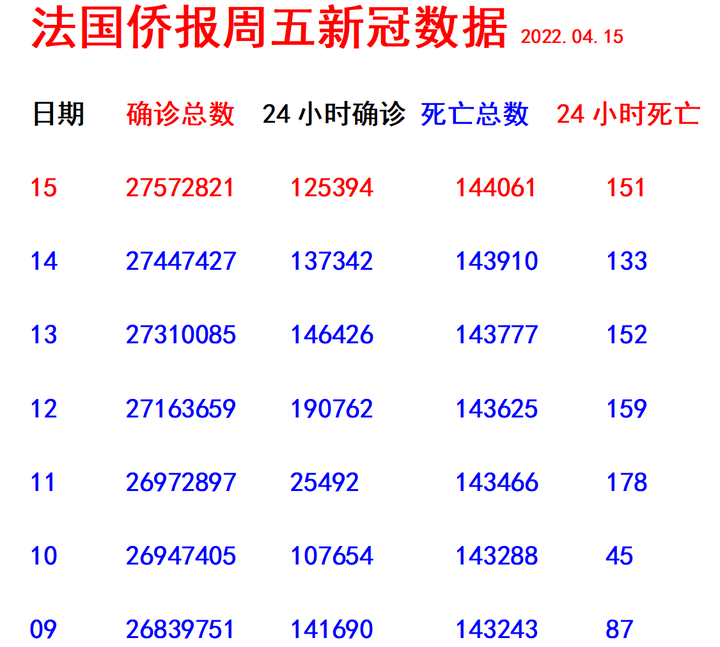 《法国侨报》讯:(记者 玉英)24小时内法国有125394人新增阳性!阳性总数达到27572821人; 24小时内有151人死亡,死亡总数为144061人。