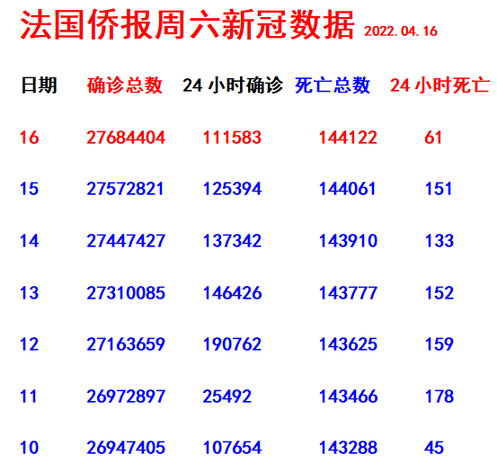 《法国侨报》讯:(记者 海芬)法国24小时内有111583人新增阳性!法国阳性总数达到27684404人。 24小时内有61人死亡,死亡总数达到144122人。