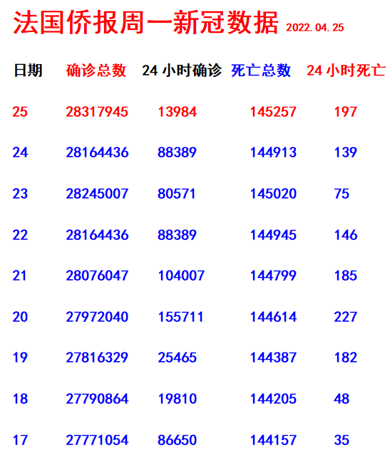 《法国侨报》讯:(记者 玉英)法国24小时新增阳性13984人,阳性总数达到28317945人。 24小时内有197人死亡,全法共有145257人死亡。