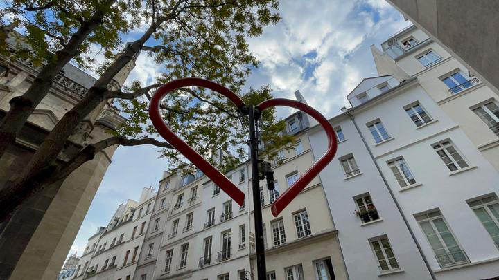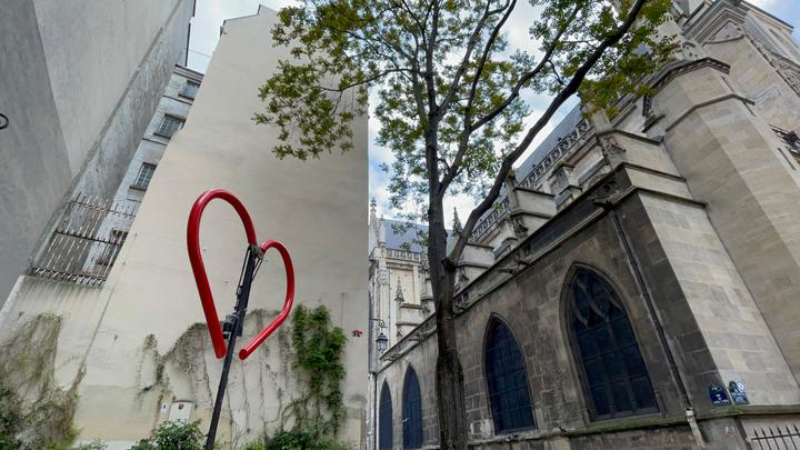 2022年4月26日星期二 巴黎阳光灿烂的日子 今天上午处理麻烦事情;下午做账……乘巴黎5区住着梦想别墅姐妹让我去拿紫苏,赶紧带上心形的粉红色口罩,出门换换心情…… 当我小心捧着我的紫苏和西红柿苗宝宝往家走时,突然发现蓬皮杜文化中心边教堂有很多人在拍照。 拍啥?我顺着他们的镜头看过去,哦哦,这里的雕塑,今天开始变了: