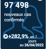 《法国侨报》讯:(记者 玉英)法国24小时内新增阳性97498人,阳性总数达到28415443人; 24小时内死亡167人,死亡总数为145427人。