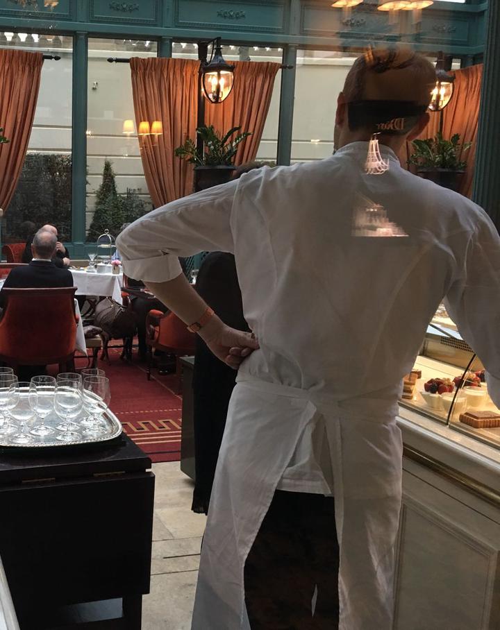 来这里喝午茶,是因为这里有被评选出的世界最佳甜点师 François Perret 。 一个下午茶,每个人平均花费80欧元左右,有点奢侈。 巴黎丽兹酒店( Ritz ),不用多介绍了,国际大牌明星、名人,如周杰伦、朗朗……,香奈儿把它当做自己的家;作家海明威 说巴黎丽兹酒店是他认为的天堂;英国王妃戴安娜生前的巴黎“家”…… 进门大堂左手,一幅手工绘制的巴黎市区旧地图,艺术珍品。