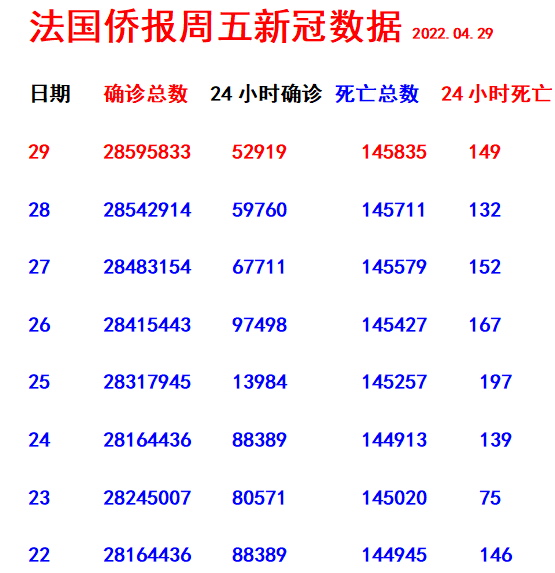 《法国侨报》讯:(记者 海芬)法国24小时内有52919人新增阳性!阳性总数达到28595833人; 法国24小时内死亡149人,死亡总数达到145835人。