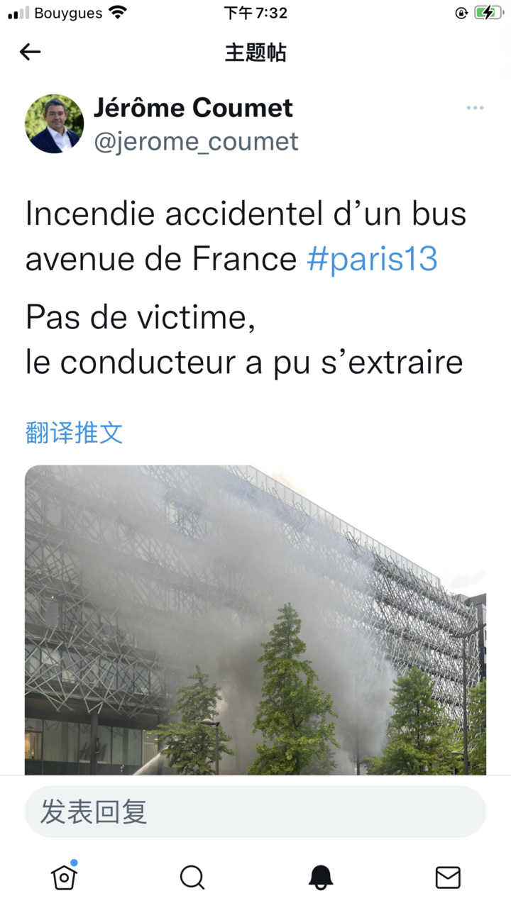 巴黎华人区13区火灾无伤亡! 巴黎华人区13区区长顾梅在推特上说: “巴黎13区法兰西大道上的公交车意外起火,好在没有受害者,司机和乘客都得以逃脱。”