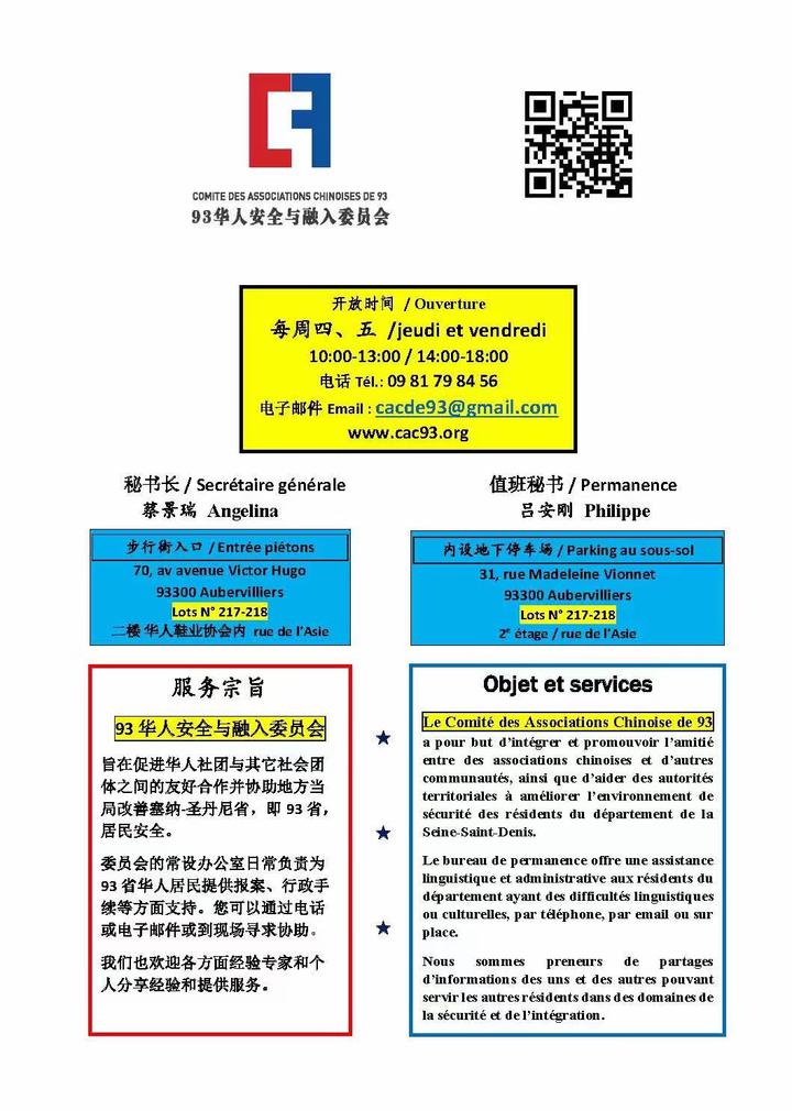 “93华人安全与融入委员会”介绍: “93华人安全与融入委员会”华人安全协调机制成立于2019 年2月,目的:打造93省奥贝赫维利耶市华人商圈的安全营商和生活环境,改善华商华人的生存、融入和发展而筹建。 特点是:改进华人与当地警察局、省政府、市政府的联系、沟通和协调,促进当地治安状况的改善。 (图片来自93华人安全与融入委员会”网站) 推广