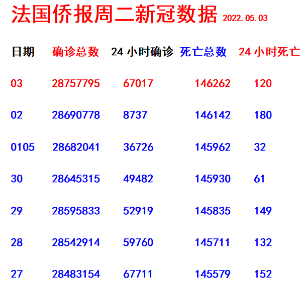 《法国侨报》讯:(记者 玉英)法国24小时内有67017人新增阳性,阳性总数达到28757795人; 24小时内有120人死亡,全法国死亡总数为146262人死亡。