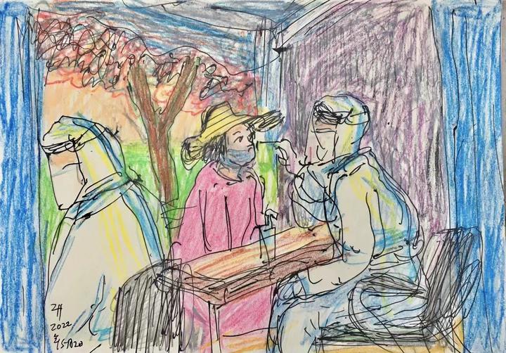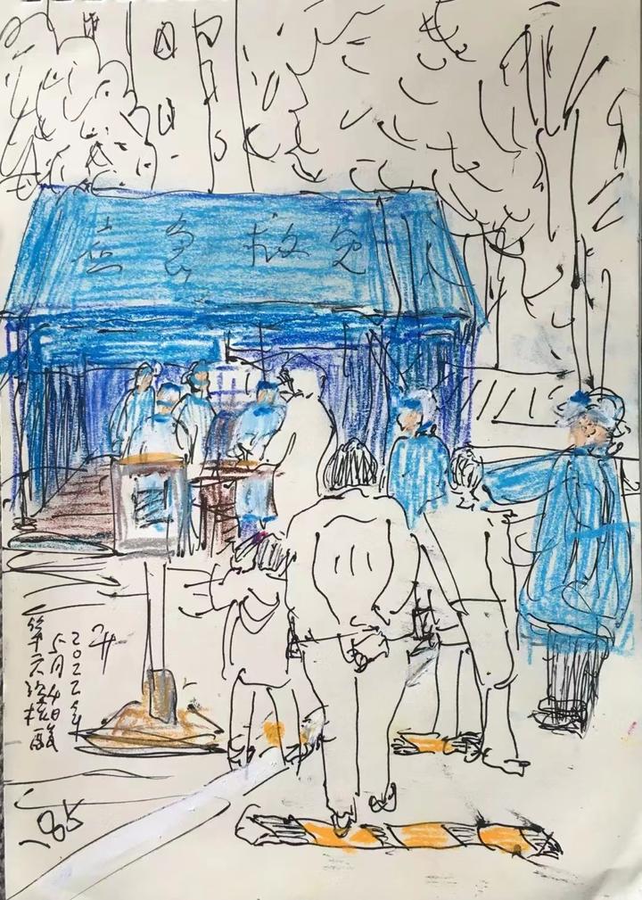 青年节虔诚面对面 今天是《五四青年节》,历史上那些在时代中挥斥方犹的青年人,固然值得纪念,但是也见到有些眼前人,例如以下两位老朋友,她们虽然已经退休,进入人生收获期,然追逐青年梦的初心不变。她们一位在北京,一位在巴黎。 北京赵蘅。她是我在廿年前巴黎华人电视节目中的采访主角之一。当年她作为访问艺术家的身份,旅居于《巴黎国际艺术城》,为期半年。她画的油画作品《草地上的萍果》灵动秀美,主题简单却内涵丰富,总统希拉克也收藏,不少朋友都称她赵苹果,名噪一时。 她有一特点,手不释卷——画卷。在旅途上,经常随时提笔写生,素描眼前当下,作品动人。她家学渊源,祖辈都是知名知识分子。她早年也是电影和刊物的动画设计师。 她喜欢旅游,出版了不少书籍画册。名著《下一班火车几时开》细致刻划了一个大时代中小青年几代人的家庭生活、爱情和心路历程,阅之使人荡气回肠。 近年,鬓如霜的赵萍果也玩微信,朋友圈中每天上传些生活照片,上写几行抒情文字,读来使人温暖地感觉当下自在。 想不到的是,在这一轮新冠围京之际,艺术家居然也能发挥本色。只见今日青年节上载的是,赵蘅在排队查核酸的现场画起了素描!