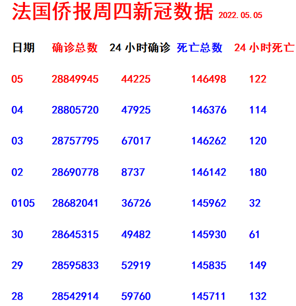 《法国侨报》讯:(记者 玉英 实习生 欣儿)法国24小时内有44225人新增阳性!阳性总数达到28849945 人; 24小时内有122人死亡,法国至今共有146000+498人死亡。