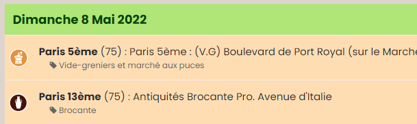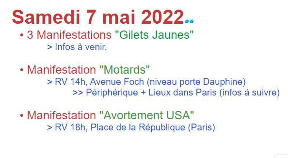 明天巴黎继续有示威 2022年5月7日星期六,巴黎有“摩托车”、“反堕胎”等3个示威活动。地点是共和国广场;14h, Avenue Foch (Porte Dauphine level)、 Périphérique等。 明后天旧货市场信息来了!