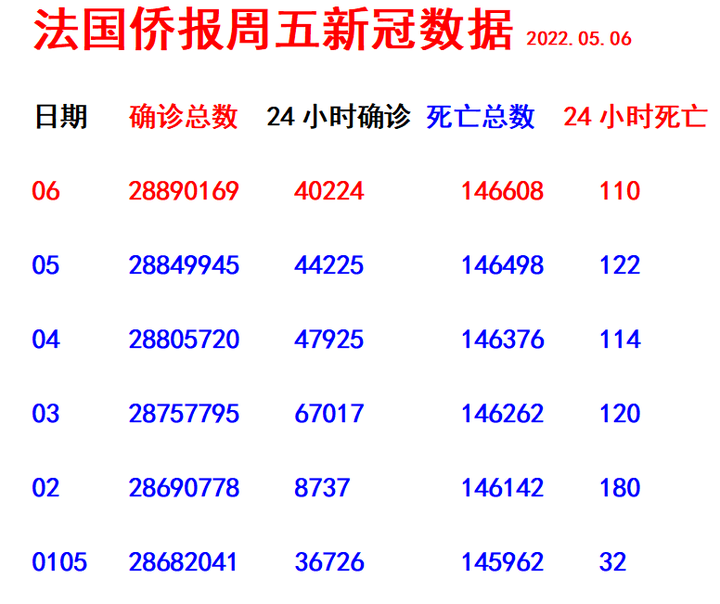 《法国侨报》讯:(记者 玉英)法国24小时内有40224人新增阳性!阳性总数达到28890169 人; 24小时内有110人死亡,死亡总数达到146608人。