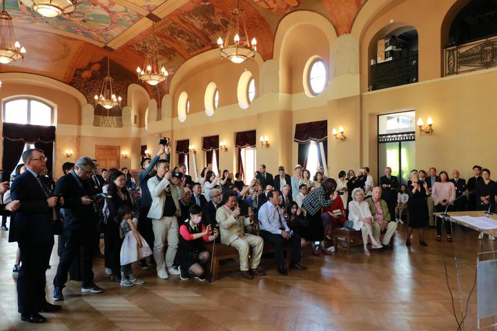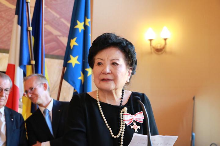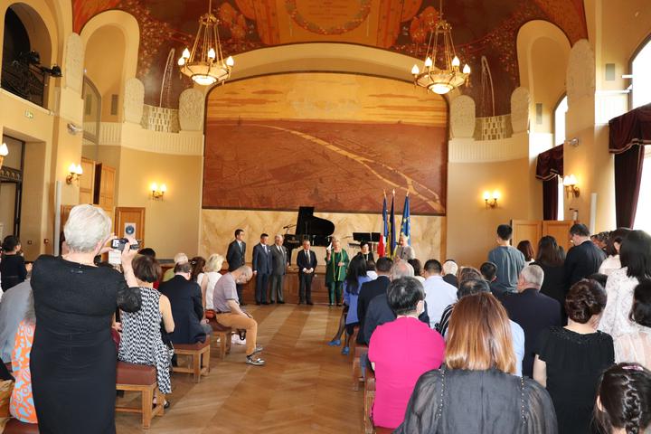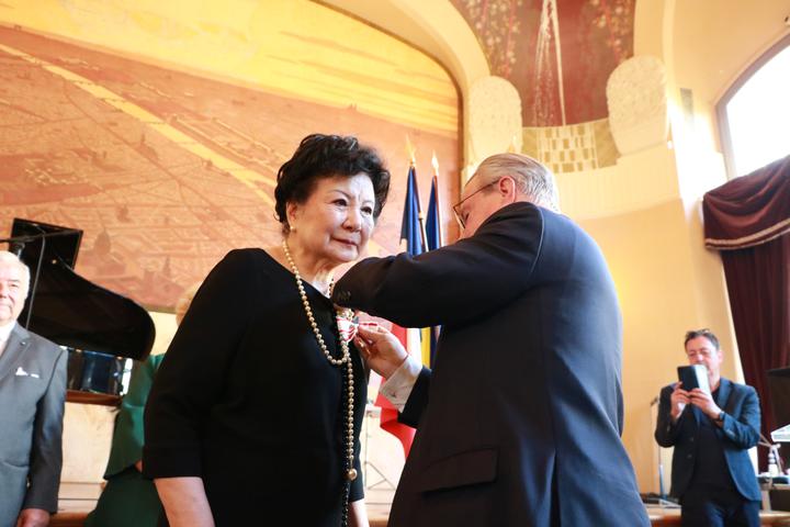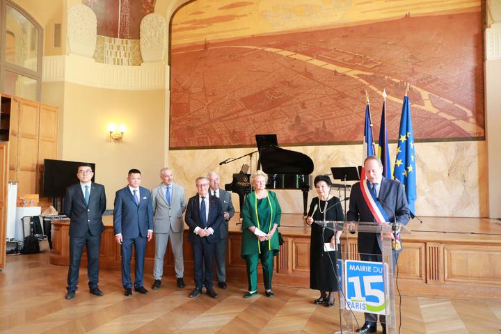 他热烈欢迎大家来到15区政府节日大厅,举办为周勤龄女士授勋仪式。他回顾了他去中国的美好经历,希望中法之间开展更多文化、艺术的交流等。