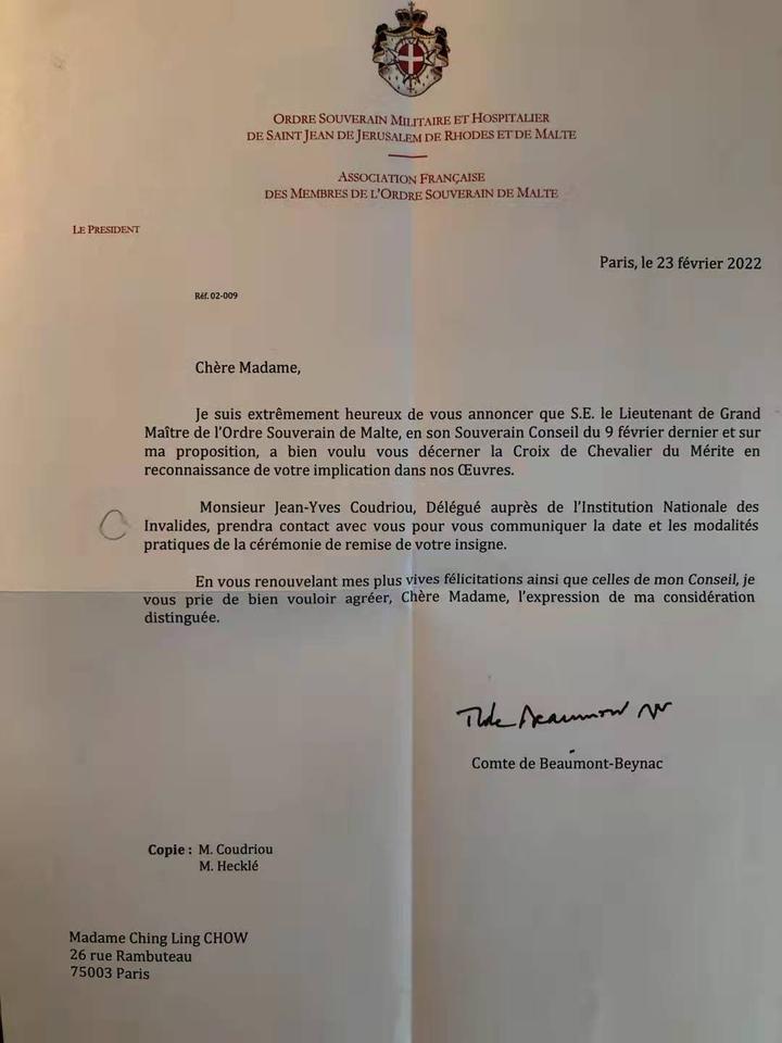 马耳他骑士勋章法国协会主席致周勤龄女士 亲爱的女士, 我极为欣喜地通知您,马耳他骑士团大教长阁下依据我的提议,于今年2月9日经最高理事会讨论,决定向您颁授圣十字勋章,以表彰您为我们的神圣事业所做的贡献。 马耳他骑士团驻荣军院代表Jean-Yves Coudriou先生将与您联系,以便和您议定颁授仪式的日期和具体安排。 亲爱的女士,本人及理事会再次向您致以最热烈的祝贺,并请您接受我最崇高的敬意。 Beaumont-Beynac 伯爵 2022年2月23日,巴黎