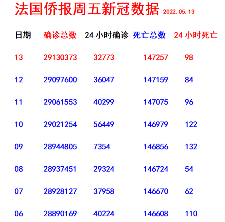 《法国侨报》讯:(记者 玉英)法国24小时内有32773人新增阳性!阳性总数达到29130373人; 24小时内有98人死亡,全法至今总共有147257人死亡。