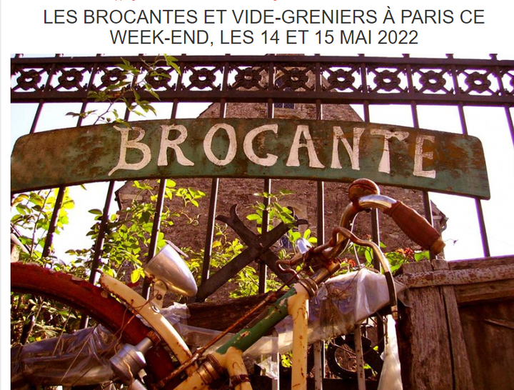 Paris 3e arrondissement ·Brocante rue de Bretagne Les vendredi 13, samedi 14 et dimanche 15 mai 2022 Lieu : Rue de Bretagne, 75003 Horaire : De 9h à 18h Paris 5e arrondissement ·Vide-greniers Mouffetard Le dimanche 15 mai 2022 Lieu : Place de la Contrescarpe, 75005 Horaire : De 7h à 19h Paris 6e arrondissement ·Vide-greniers Rue Michelet, angle Assas et Observatoire Le dimanche 15 mai 2022 Lieu : Allée Denise Vernay,Rue Michelet, angle Assas et Observatoire, 75006 Horaire : De 7h à 18h Paris 9e arrondissement ·Antiquités Brocantes Professionnelles Boulevard Haussmann Les samedi 14 et dimanche 15 mai 2022 Lieu : Boulevard Haussmann, 75009 Horaire : De 7h à 19h Paris 10e arrondissement ·Vide-greniers rue du Faubourg Saint-Martin Le samedi 14 mai 2022 Lieu : Rue du Faubourg Saint-Martin, 75010 Horaire : De 7h à 19h Paris 11e arrondissement ·Vide-greniers Boulevard Richard Lenoir Le dimanche 15 mai 2022 Lieu : Boulevard Richard-Lenoir, 75011 Horaire : De 7h à 18h Paris 12e arrondissement ·Brocantes et puces de la place d'Aligre Les samedi 14 et dimanche 15 mai 2022 Lieu : Place d'Aligre, 75012 Horaire : De 8h à 14h Paris 14e arrondissement ·Puces de Vanves Lessamedi 14 et dimanche 15 mai 2022 Lieu : Avenue Marc Sangnier et Georges Lafenestre, 75014 Horaire : De 7h à 14h ·Vide-greniersBoulevard Arago Le samedi 14 mai 2022 Lieu : Boulevard Arago, 75014 Horaire : De 7h à 18h ·Vide-greniers de l'Avenue Reille Le dimanche 15 mai 2022 Lieu : Avenue Reille, 75014 Horaire : De 7h à 18h Paris 15e arrondissement ·Marché du livre ancien et d'occasion Lessamedi 14 et dimanche 15 mai 2022 Lieu : 104, rue Brancion, 75015 Horaire : De 9h à 18h ·Vide-greniers du printemps Le dimanche 15 mai 2022 Lieu : Rue Saint-Charles, 75015 Horaire : De 7h30 à 18h Paris 16e arrondissement ·Brocantes Mozart Les samedi 14 et dimanche 15 mai 2022 Lieu : Avenue Mozart, 75016 Horaire : De 7h à 19h Paris 18e arrondissement ·Marché aux Puces de Clignancourt Lessamedi 14 et dimanche 15 mai 2022 Lieu : Avenue de la porte de Clignancourt, 75018 Horaire : De 8h à 19h ·Vide-greniers à Montmartre aux Artistes Le samedi 14 mai 2022 Lieu : Rue Ordener, Montmartre aux Artistes, 75018 Horaire : De 9h à 19h ·33e brocante des Abbesses Les samedi 14 et dimanche 15 mai 2022 Lieu : Place des Abbesses, 75018 Horaire : De 8h à 18h ·6ème vide-greniers du Village Clignancourt Le dimanche 15 mai 2022 Lieu : Rue du Ruisseau, Rue Esclangon, 75018 Horaire : De 9h à 18h Paris 19e arrondissement ·Vide-greniers du Belvédère Le samedi 14 mai 2022 Lieu : Résidence Le Belvédère, 75019 Horaire : De 9h30 à 18h30 ·Vide-greniers de la rue de la Villette Le dimanche 15 mai 2022 Lieu : Rue de la Villette, 75019 Horaire : De 8h à 18h Paris 20e arrondissement ·Marché aux puces de la porte de Montreuil Lessamedi 14 et dimanche 15 mai 2022 Lieu : Porte de Montreuil,Avenue du Professeur André Lemierre, 75020 Horaire : De 8h à 18h30 ·Brocantes et vide-greniers Cours de Vincennes Nation Le dimanche 15 mai 2022 Lieu : Terre plein central cours de Vincennes, 75020 Horaire : De 7h à 19h |