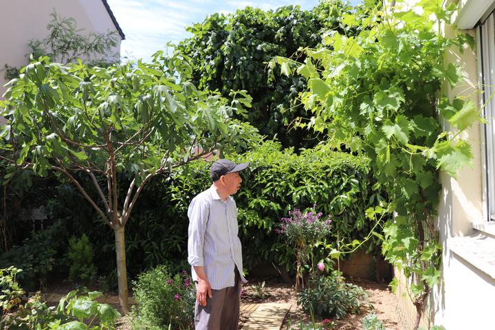翁老院子里打理得干干净净:鸟儿在枝头不停地唱歌;花园四周种着无花果等果树;花园中间居然是一长排韭菜!传统的中国韭菜! 小编请蔡君柱主席用温州话问翁老,韭菜来自哪里? 翁老居然回复说:“这是我60年前从国内带来的韭菜种子种的!一直长到今天啦!”