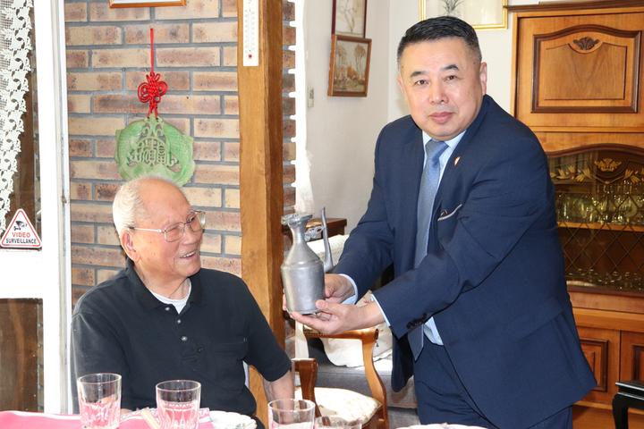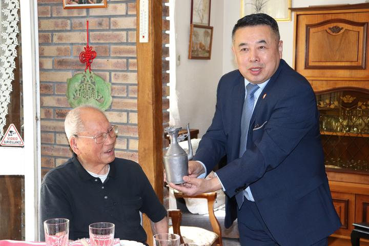 翁老先生是我们法国华侨华人会的名誉主席,也是我会年龄最大的百岁老人。他1919年出生于中国浙江省温州市瓯海区仙岩街道渔潭村人。 翁正存先生是我们法国华侨工商互助会(1947)的创始人之一,几十年的在异国生涯,他是我们侨界活动的创始人、见证人,从法国华侨工商互助会到旅法华侨俱乐部再到现在的法国华侨华人会,我们协会虽然几度更名,但在翁老的情牵乡梓的拳拳赤子之心感召下,一直初心不改,让侨胞在异国他乡抱团取暖,回馈家国与社会。今天看到翁老耳聪目明、精神矍铄,让我们十分欣慰! 我对翁老爱国爱乡的奉献精神、勤劳朴实的创业品质和互帮互助的友爱情怀,以及一直以来对法国侨社发展做出的贡献和支持表示感谢!我作为法国华侨华人会第二十四届新一届主席,将以您为榜样,继续热心社会公益事业和社团工作,把我们自己对祖(籍)国的热爱,一代代的传承下去,永不间断!祝翁老幸福安康、福寿无疆! 更多相关图片: