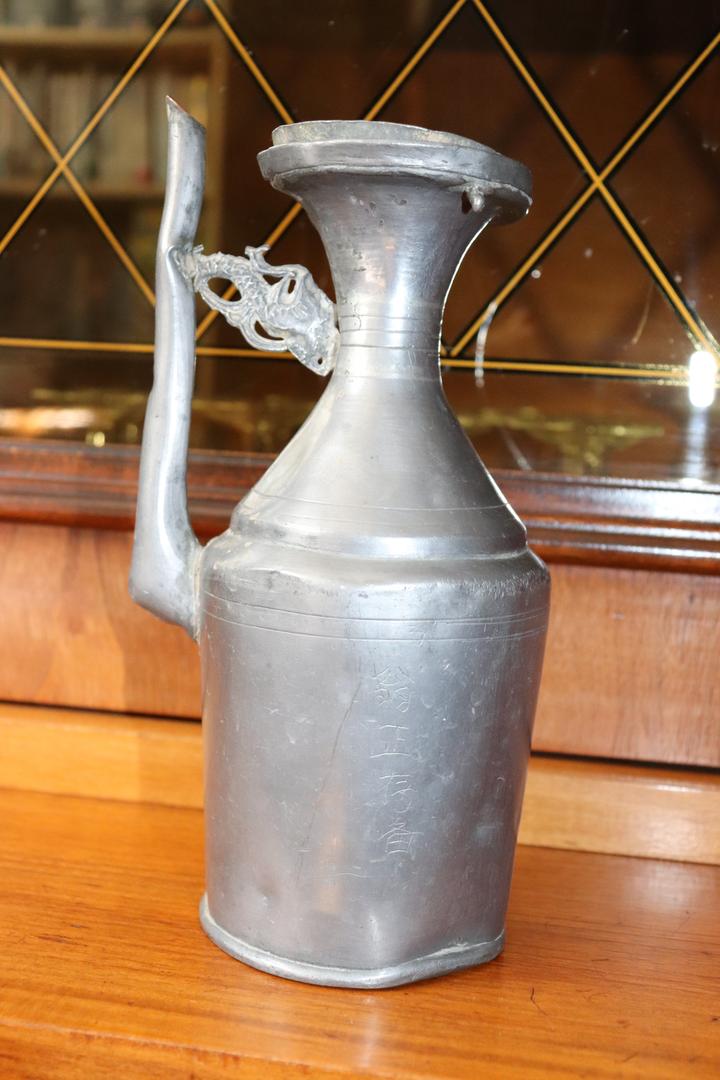 话音刚落,蔡君柱主席拿着一个锡壶从里面客厅出来,问翁老:“这是我们温州以前喝酒用的锡壶,你这个锡壶是哪里来的?”