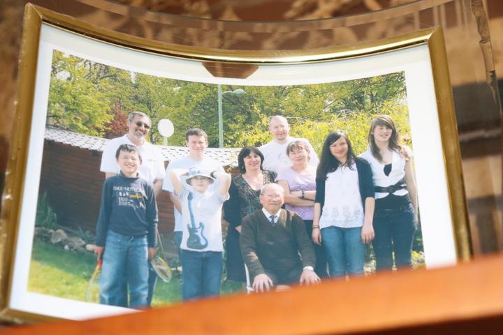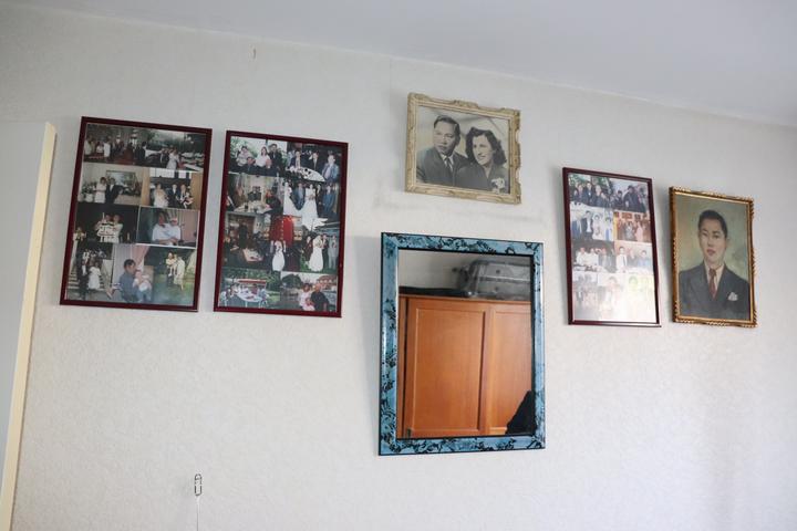 (前排坐在翁老身边的是他的女儿) 今天,翁老60多岁的长女和他一起热情地接待了大家。 翁老的家里前后花园,有两室两厅。 翁老家里的布置很法式:墙上几乎都挂上了家人的照片、雕塑等:翁老母亲的红色雕塑占了最主要的位置;客厅里的家具里,椅子是法式的;茶几是中式的;墙上挂的照片,从翁老小时候、结婚、第一代孩子到第二代孩子的都挂满各个房间……