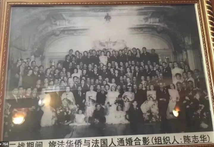 法国华侨华人会里挂着一幅"二战期间旅法华侨与法国人通婚合影"照片。翁老说,他是当年这张照片中的百对夫妇唯一在世的老人了……
