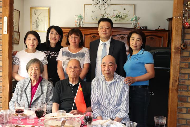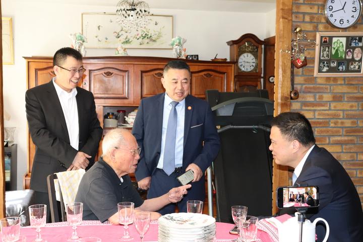 初一见面,发现翁老耳聪目明,一口流利的温州话……大家都惊喊:哪里会是104岁的百岁老人!简直就是80多岁的长者啊! 翁老听了哈哈一笑:我出门去街上,法国人看到我也都说我80多岁,其实我早就过了100岁,今年104岁啦! 第二:翁老是旅法最年长的华人前辈 今天,法国华侨华人会第24届主席蔡君柱、第22、23届主席任俐敏、法国青田同乡会会长叶旭群、法国中法友谊互助会会长姜学锋、欧洲浙江华人联谊会会长陈旭东、“全球通”法国侨胞服务中心主任戴国荣、翁老的外甥、外甥女及下一辈10多人,一起“左手红酒、右手鲜花和温州炒粉干、烤鸭等温州传统菜”,浩浩荡荡去看望了翁老。