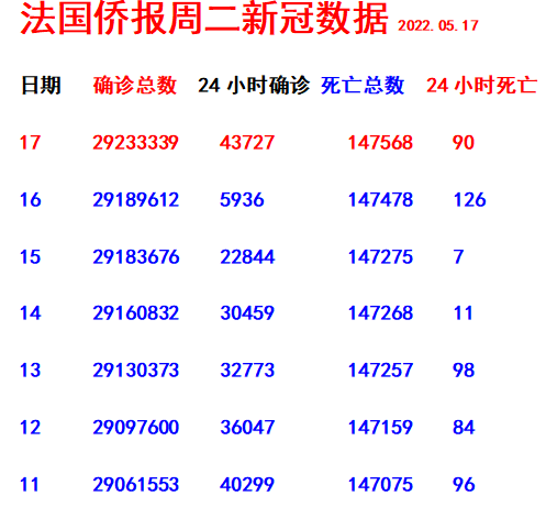 《法国侨报》讯:(记者 玉英)法国24小时内有43727 新增阳性,阳性总人数达到29233339 人; 24小时内有90人死亡,死亡总数达到147568人。