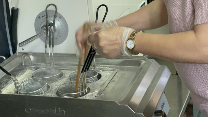 面条机器里出来的面条均匀地飘在干干净净的钢板上。 老板娘戴着手套,把面条拿到开水锅里。