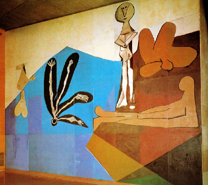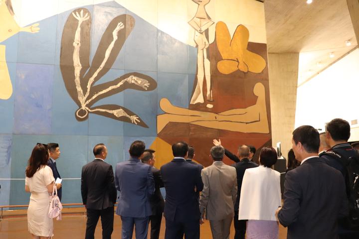 接着,大家跟随景峰主任来到最负盛名的艺术品——二号会议室看外墙上毕加索(PaboPicasso,1881-1973)为联合国教科文组织绘的巨幅墙画《伊卡洛斯的坠落》( The Fall ofcarus),画幅总面积近90平方米,以40块画板拼接而成。画面沿袭了1956年毕加索的“裸浴者”系列画风,大海、沙滩和抽象的裸男女,唯独中央绘了一个头朝下坠落的骨架形象。