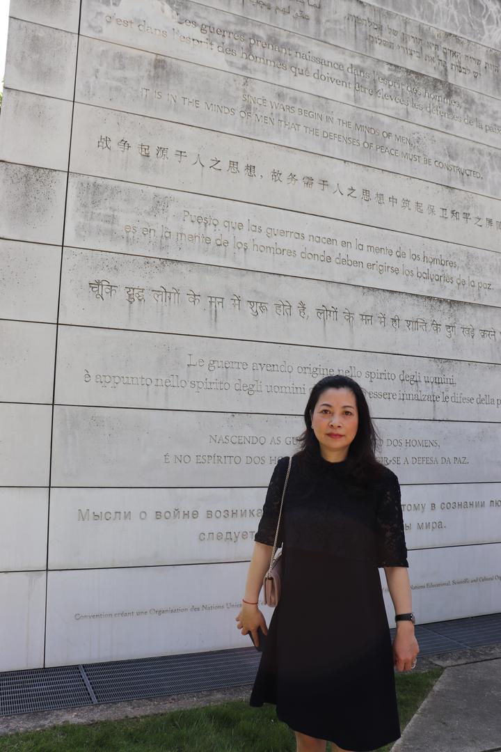 我们一行跟随景峰主任,首先来到象征教科文组织“组织法”的石碑。上面用多种语言写着:战争起源于人之思想,故务需于人之思想中筑起保卫和平之屏障。